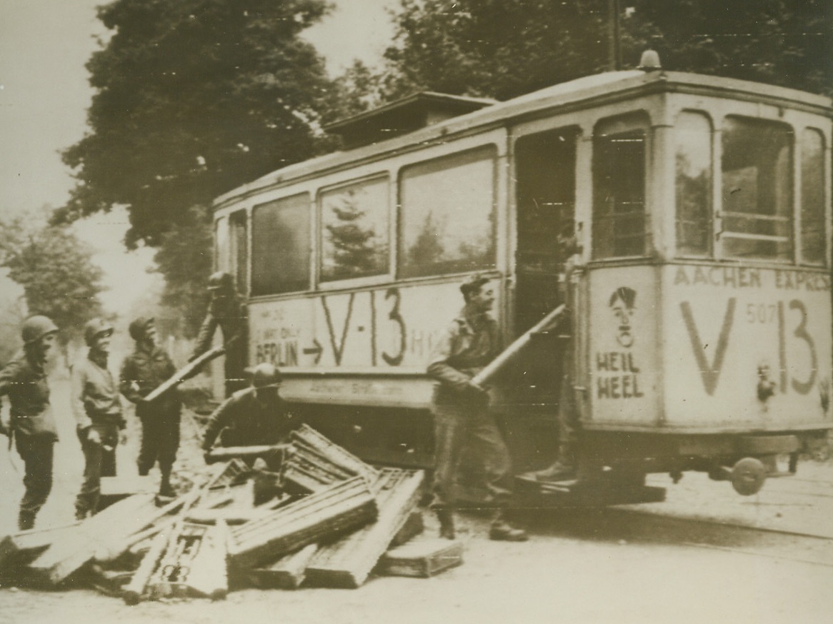 Street Car of Dynamite Headed for Aachen, 10/12/1944. GERMANY – American doughboys load up the V-13, a streetcar, with German ammunition before rolling it downhill where it exploded in the middle of the Nazi garrison at Aachen. this “secret weapon” has been used with notable effect in blasting the Nazis of Aachen from their dugouts. Photo by Acme photographer, Andrew Lopez, for the War Picture Pool.Credit (Acme Photo via Army Radiotelephoto);