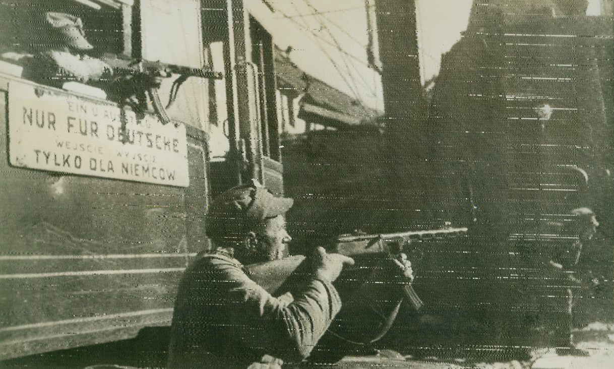 Polish Patriots Blast Nazis in Praga area, 10/1/1944. PRAGA, POLAND – One Polish tommy-gunner takes aim at German soldiers in Praga from the ground, while the other leans out the window of a trolley, which ironically bears a sign saying “For Germans Only.” Meanwhile, in nearby Warsaw, the situation is reported “critical,” and a German communiqué stated that more of the trapped troops were smashed in Warsaw, while others surrendered unconditionally. Praga is a suburb of Warsaw.Credit (Acme Radiophoto);