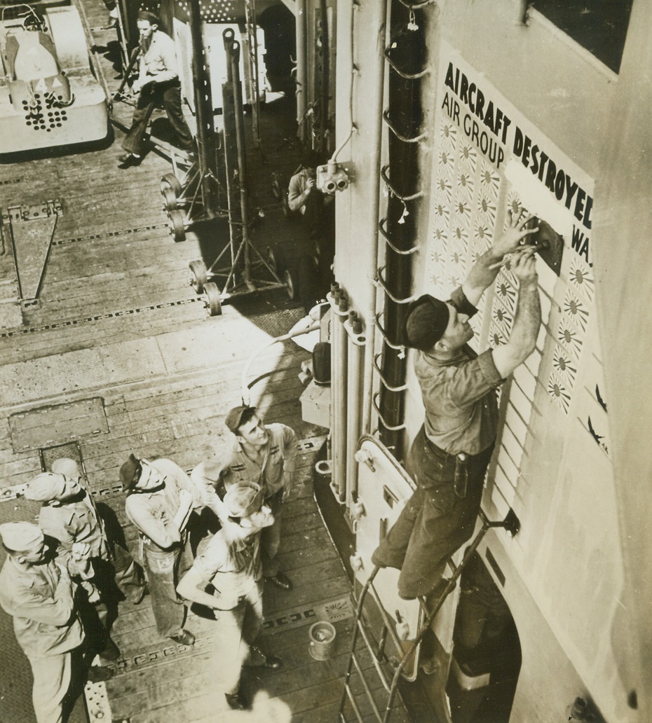 No Title. 10/14/1944. At Sea – A group of sailors watch intently as a crew member posts the score of Jap planes destroyed after the first U.S. carrier sweep against Manila, capital city of the Philippines. Credit-WP-(ACME);