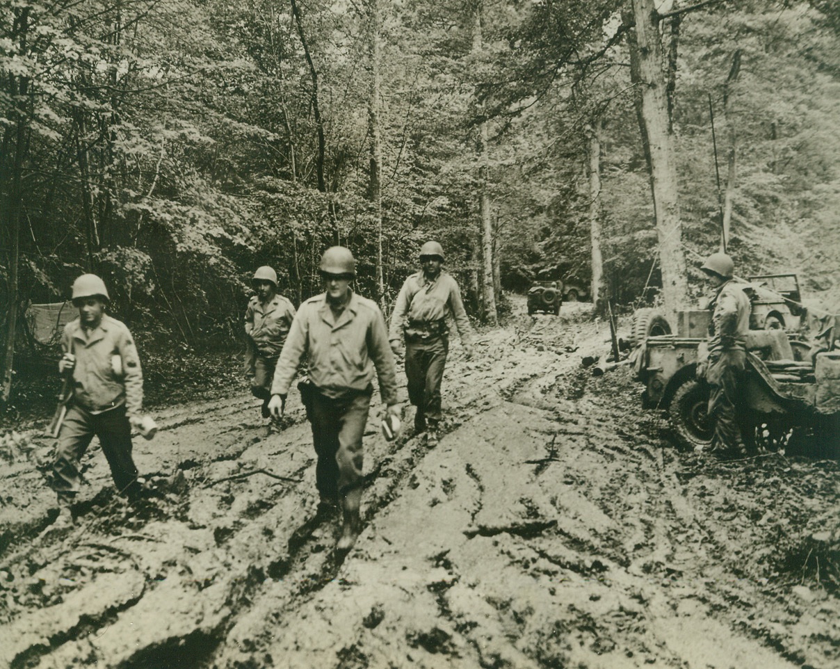 THE SAME OLD COMPLAINT—MUD!, 10/3/1944. FRANCE—As these Yanks plow through the sticky mud in their bivouac area, some of them are reminded of the stories their dads told of the last war. But, when chow is in the offing, it takes more than mud to keep the men away.Credit: U.S. Signal Corps photo from Acme;