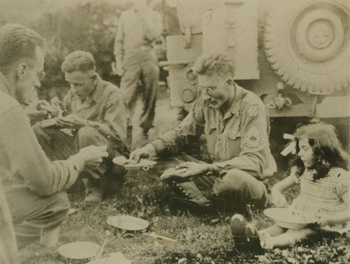 THE TOT WHO CAME TO DINNER, 10/2/1944. SOMEWHERE IN FRANCE – Sitting beside her new Yank friends, a tiny French girl shares pot luck with boys of the Third division as they squat for mess somewhere in France.Credit: Signal Corps Radio telephoto from Acme;