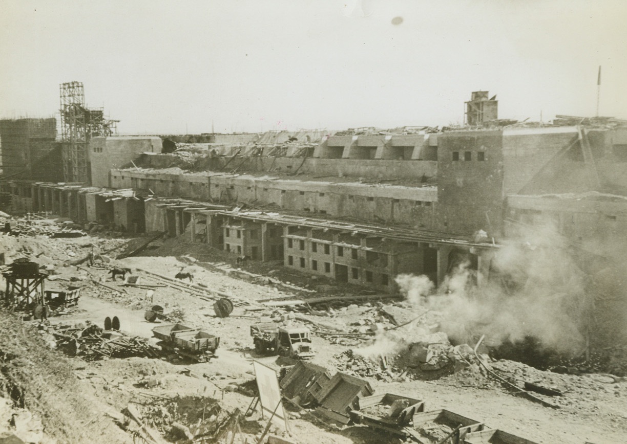 The Big “Leak” in Nazis Gas Tank, 10/4/1944. Rumania – This photo, just received, shows the devastation dropped on the Concordia Vega refinery at Ploesti, one of the installations smashed by some 13,000 tons of Allied bombs in 23 large-scale attacks. Above, little more than scrap metal remains of this plant which one helped to keep Hitler’s war machine going. The area is now in Russian hands. Credit: (USAAF Photo from ACME);