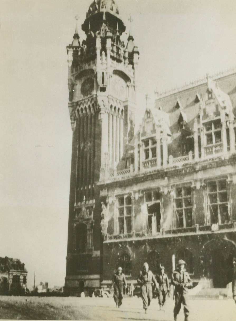 CANADIANS PASS CALAIS LANDMARK, 10/4/1944. A group of Canadian troops on patrol in the French port of Calais, pass the famous clock tower which, on a clear day, can be seen from Dover, England, across the Channel. Credit Line (ACME Photo via Army Radiotelephoto);