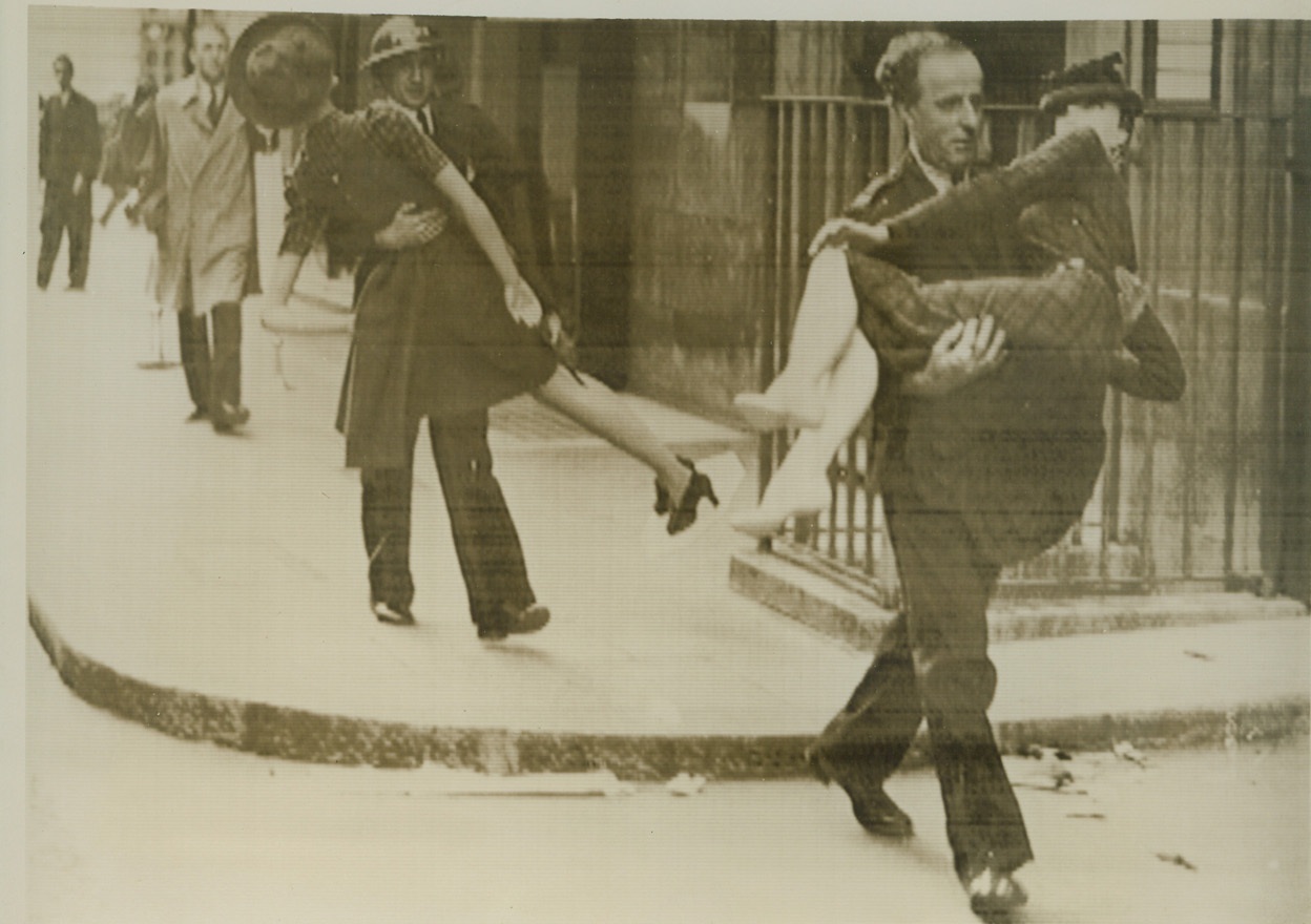 Rescue Squad at Work in London, 9/18/1940 LONDON — Casualties of Germany’s fierce air attack on London’s fashionable shopping district, Sept. 17, are being taken to a place of safety. However, the “women” being carried by rescue workers are only the wax dummies blown out of windows of department stores by the bomb concussions. Many of the models just melted away in fires caused by the raid. Credit (ACME Cablephoto);