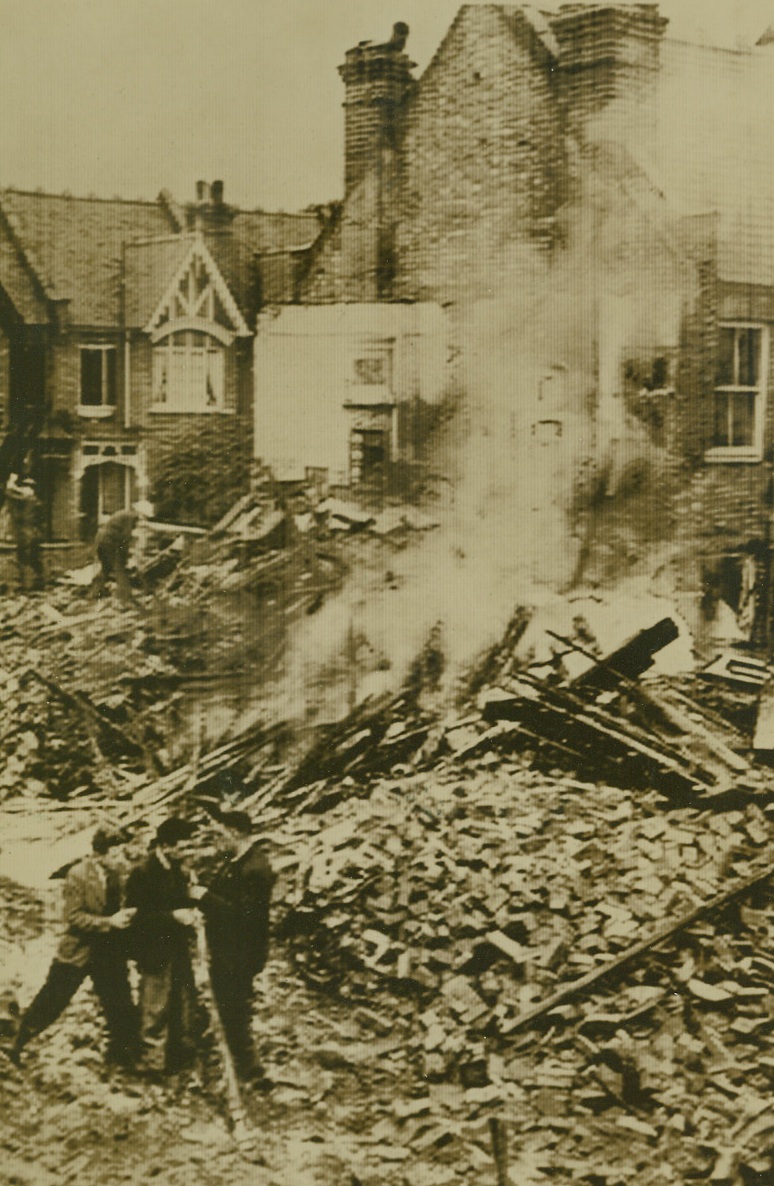 WHERE NAZI PLANE FELL ON LONDON HOUSE, 9/20/1940 LONDON—Blazing wreckage of a raiding German plane after it fell and smashed a London home. Credit: Acme Cablephoto;