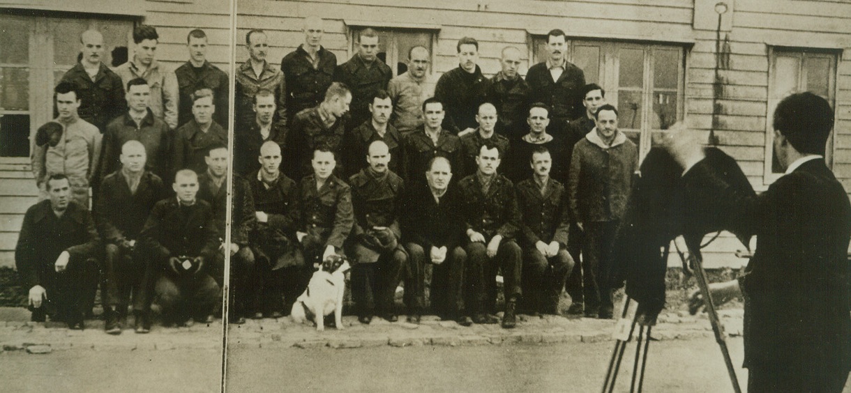 JAP PROUDLY PHOTOGRAPH THEIR WAR PRISONERS, 9/11/1942. SHANGHAI—In a caption accompanying this photograph in “Freedom,” Japanese propaganda magazine published in Shanghai, this scene is described as U.S. and British was prisoners being photographed by a professional Jap cameraman in Shanghai concentration camp. Purpose of the picture, like all those published in the magazine, is to show that the Japs don’t mistreat their prisoners. “The camp mascot was not forgotten,” the caption points out—no doubt one of those warm, human touches for which the perpetrators of Pearl Harbor are famous. Credit: ACME.;