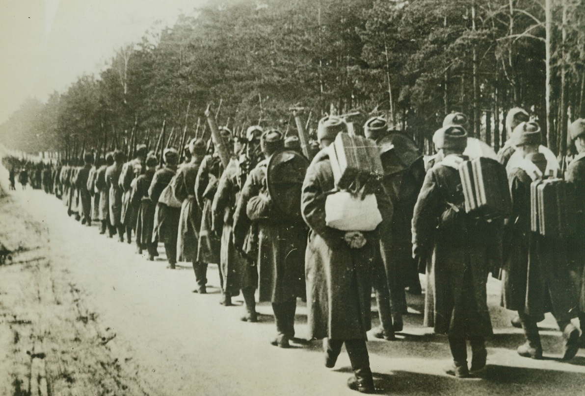 End of Their Army Careers, 9/17/1942. Russia—Russian villagers watch this long line of captured Nazi soldiers marching along a dusty road behind the Soviet lines into captivity. Their armed guards watch them closely. The Nazis are gaining ground in Russia, but only at the cost of many men lost and captured, and much equipment destroyed—if they can gain enough ground, they’ll lose the war. (Passed by censor). Credit: ACME.;