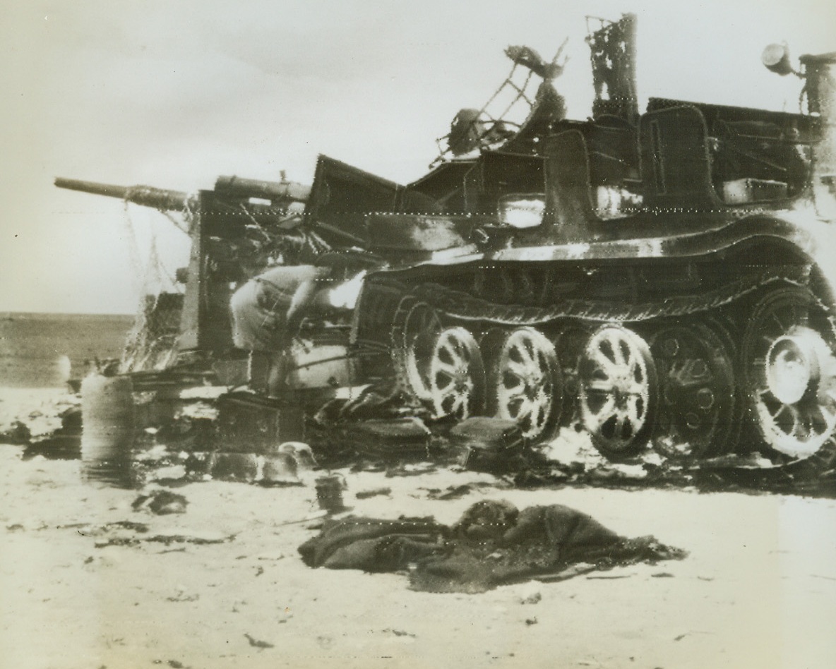 Badly Busted, 9/9/1942. Western Desert – – A British tommy gets a close look-see at this busted and battered tractor which was once used to draw the 88 mm Nazi gun in the background. The whole outfit, which included accommodations for the German gun crew, was made scrap by direct hits of crack British artillery gunners. Wrecks like this one are not unusual sights on the Western Desert front where Allied airmen and soldiers have successfully checkmated Rommel’s drive for Alexandria and the Suez. Photo was radioed directly from Cairo to New York, Sept. 9th. Credit line (ACME radio photo);