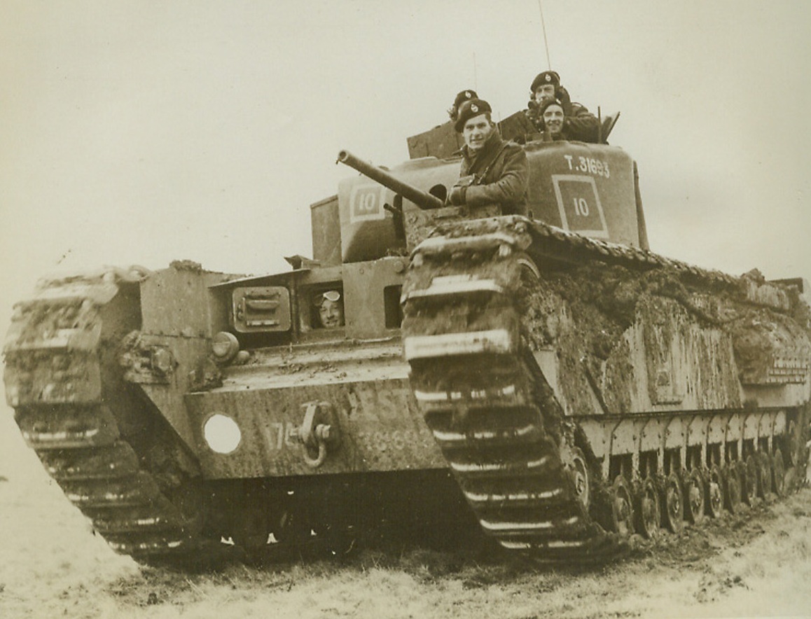 Churchill’s Namesake, 9/28/1942. England—Britain’s new infantry tank, shown here on maneuvers, is called the “Churchill.” It is so heavily armored that it can be used as a pill-box, has 6-pounder guns, and can move along at a startling speed. (Passed by censor). Credit: Official British photo from ACME.;