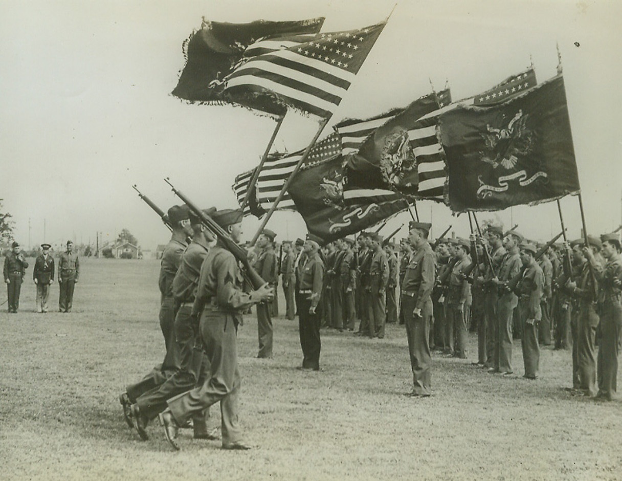 The New 94th Division Receives its Colors, 9/16/1942. Fort Custer, Mich.: Color guards are shown marching with Regimental colors and standards which were presented to the Regimental commanders of the new 94th division which was “activated” in formal divisional review. Major General Harry J. Maloney, Division Commander; Col. Young, and Brig. Gen. Louis J. Fortier, are shown at left.Credit: ACME.;