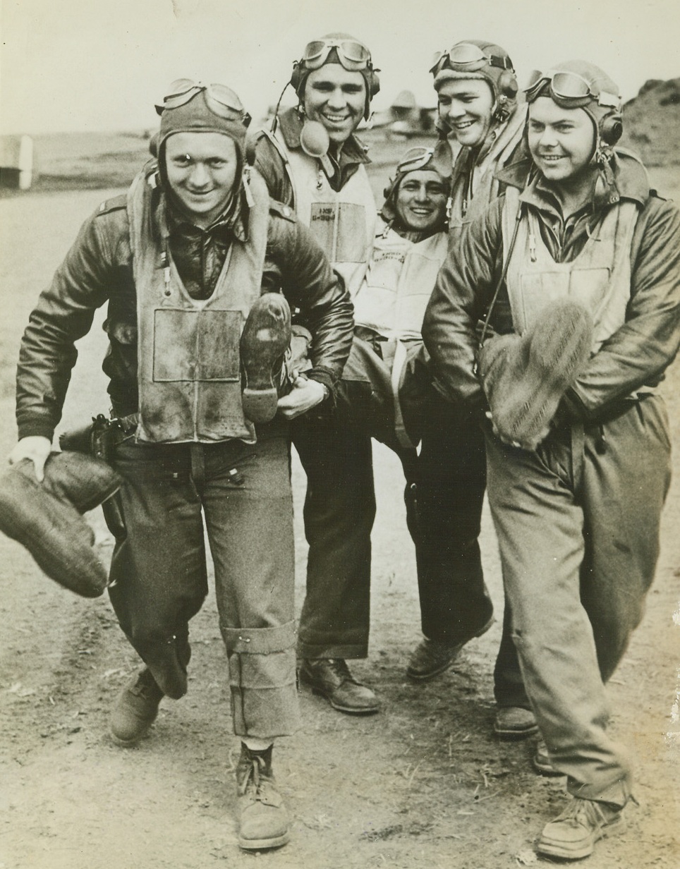 Flying Tigers in Alaska, 9/15/1942. Kiska, Alaska—A squadron of “Flying Tigers” has been formed in Alaska under the command of Major John Chennault, son of General Chennault, leader of the famed “Flying Tigers” in China. Here, members of Major Chennault’s “Flying Tigers” gave one of their buddies a boisterous accolade for shooting down a Jap dive bomber—maybe he shoulda stood in his plane. Left to right: Lt. H.B. Barnard; Lt. M.J. Buku; Lt. W.E. Brinkeman; Lt. R. Dale; and Lt. M.S. Fetz.Credit: Army Signalcorps photo from ACME.;