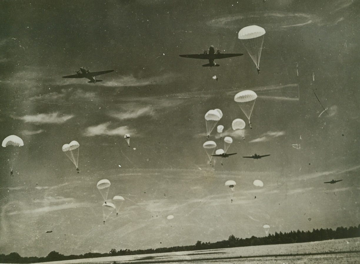 Dress Rehearsal, 9/18/1942. England—During mass invasion exercises in Britain, U.S. parachute troops float down from the skies from operational altitude. Although these troops have been in England for some time, their presence was only made known September 18th from the headquarters of Lt. Gen. Dwight D. Eisenhower, commander-in-chief of the A.E.F. in Europe. Credit: ACME.;