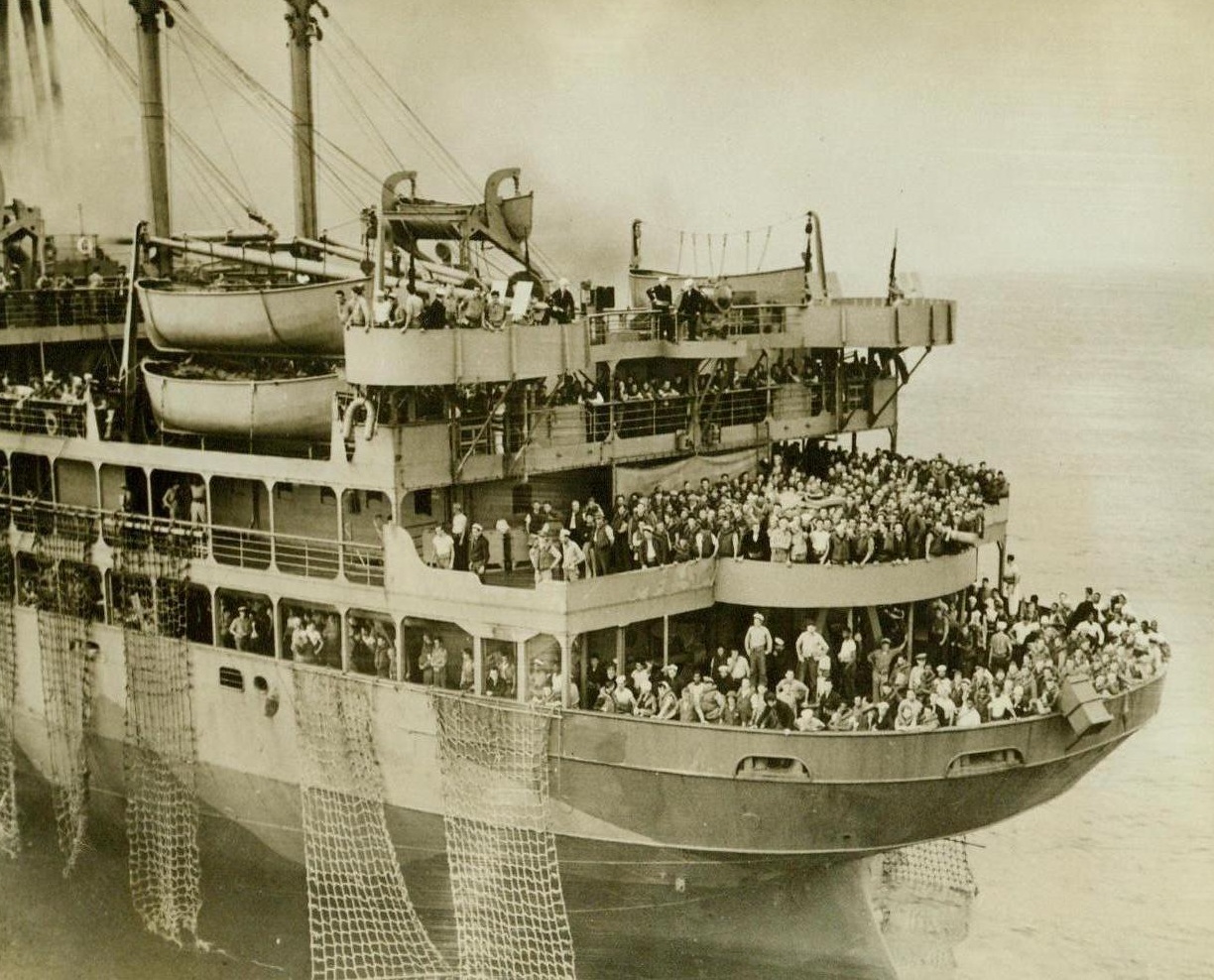 Rescue Of Wakefield Passengers, 9/9/1942. Washington, D.C. — There is no trace of panic among these courageous passengers and crew members on the burning U.S. Transport Wakefield as they quietly wait on the stern decks of the ill-fated ship for rescue aboard the cruiser from which this photo was taken. Note rope ladders that have been let down over the sides. Orderly conduct of the survivors permitted the rescue of some 1600 persons. Though fire swept completely through the former luxury liner S.S. Manhattan the evening of Sept. 3, the vessel is reported to have been salvaged and is now safe in an Atlantic port. 9/9/42 (ACME);
