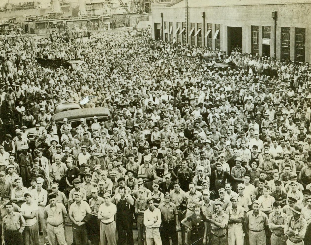 Charleston Navy Yard Workers’ Labor Day Meeting, 9/8/1942. Charleston, S.C. — Here’s part of the large crowd of workers which attended the Labor Day celebration at the Charleston Navy Yard — After day’s work was over. Celebration included the laying of two keels for landing ships. Workers at the yard pledged to build more ships, better ships, and buy more bonds to finance ships. 9/8/42 (ACME);