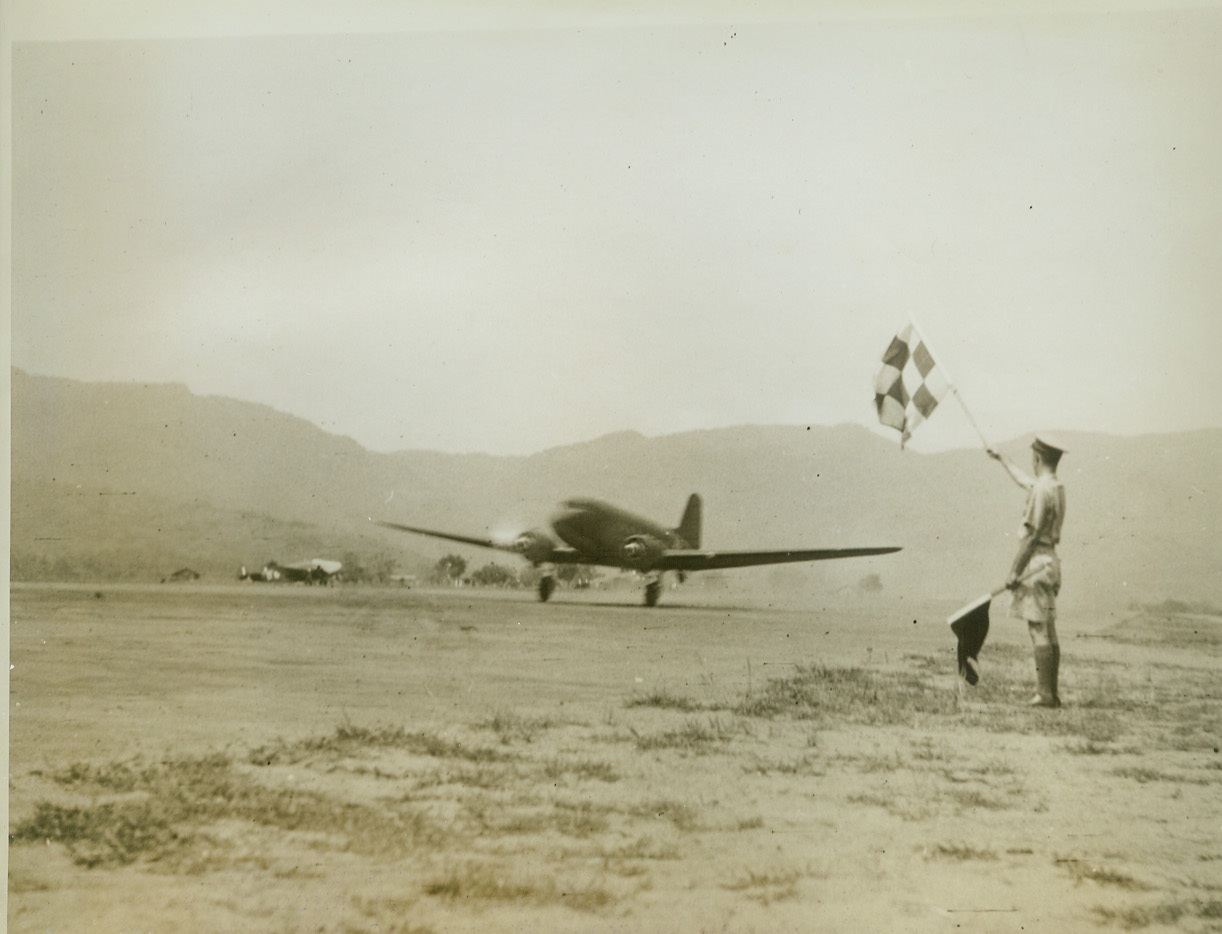 A debris-strewn airfield, 9/17/1942. New Guinea—A debris-strewn airfield marks the end of a surprise Jap raid on the Allied base of Port Moresby. An American P-39 circles low over the landing field to see if the terrain is in shape for a landing. American and Australian soldiers pick up scraps of wood and metal and repair damage which was not great. Credit: ACME;