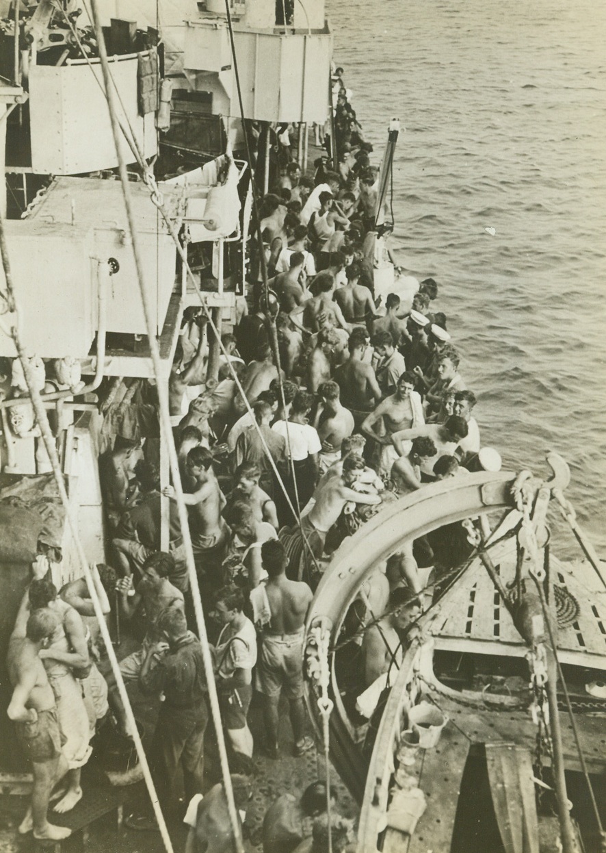 Rescue of Survivors from H.M.S. Dorsetshire, 9/8/1942. Indian Ocean – It’s all past history to these survivors of the British Cruiser H.M.S. Dorsetshire as they crowd the decks of the British Destroyer that came to the rescue, telling their buddies their experiences during the action in the Indian Ocean in which the Dorsetshire and another cruiser were sunk. From their attitudes, you’d think that they were just sunning themselves on deck. Credit: ACME;