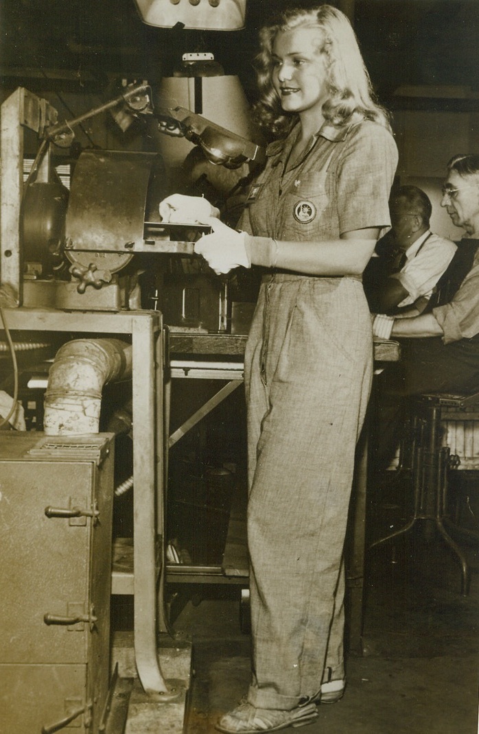 Ingrid in Overalls, 9/23/1943. Minneapolis, Minn. – Here’s the face that decorated countless barracks walls – but pretty Ingrid Vallo has hidden her eye-catching gams in a pair of war worker’s overalls, for the duration. Even the lovely blonde tresses are hidden beneath a safety cap as she works at her drill press in a Minneapolis war plant. See ACME photo #646764 for a glimpse of Ingrid in peacetime as an eye-filling pin-up. Credit: (ACME);