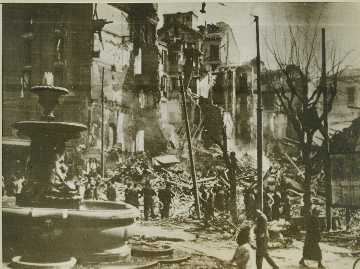 Still the Best Method of Persuasion, 9/10/1943. MILAN – Words of reason, entreaty or threat had no effect on our fascist enemies until we started to back them up with destructive force. Typical of that force is the bombing of Milan, chief railroad center of northern Italy. Here is the Piazza San Carlo in Milan as it appeared after one of the raids.Credit Line (Acme) WP;
