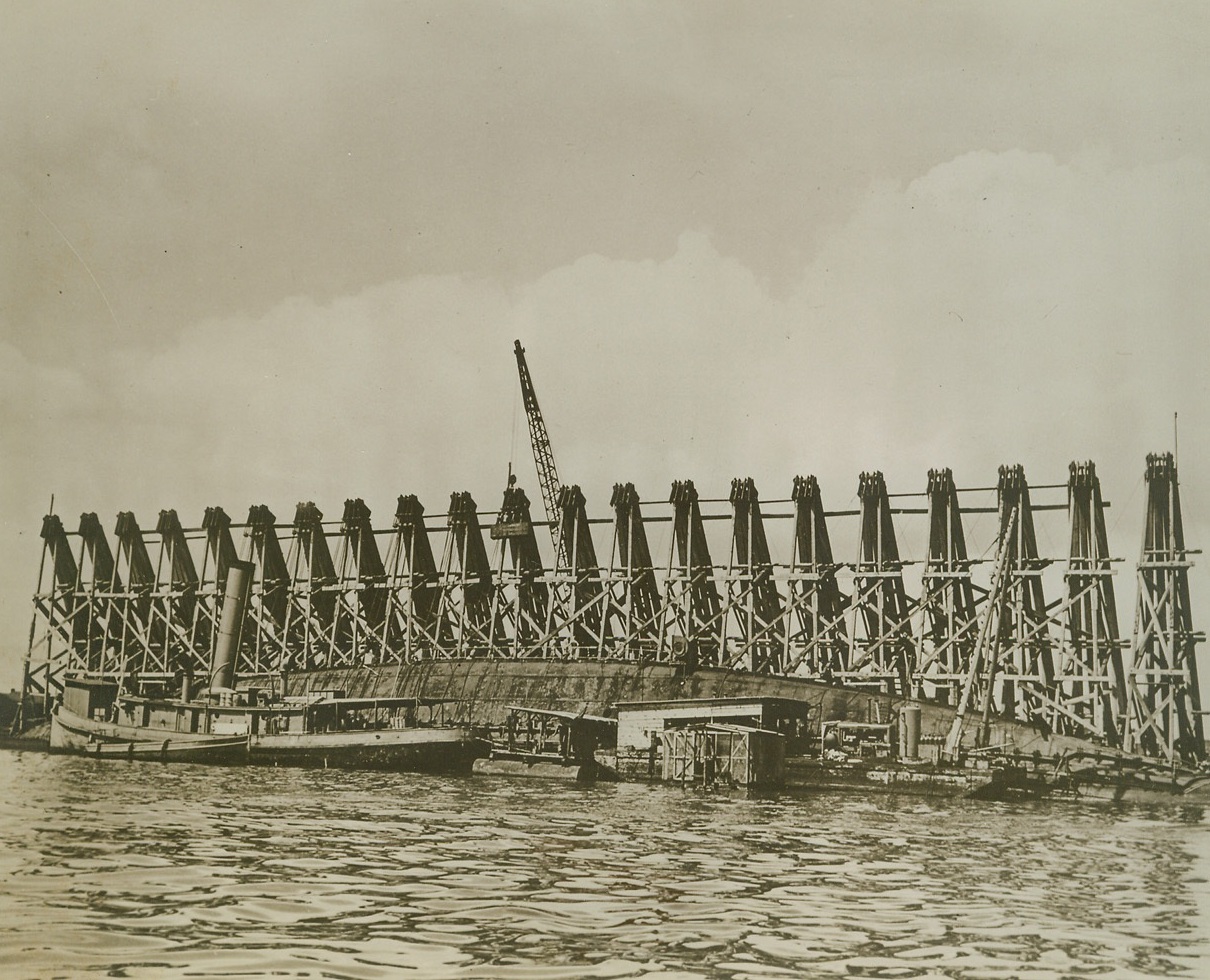 Raising the Battleship Oklahoma, 9/21/1943. This photo, just released by the U.S. Navy, shows the battleship U.S.S. Oklahoma being raised from the bottom of Pearl Harbor, where the warship was sunk during the Jap attack. Giant timber frames erected along the hull have cables running over them and to winches ashore, which slowly draw the vessel upright. Credit: (U.S. Navy Photo from ACME);