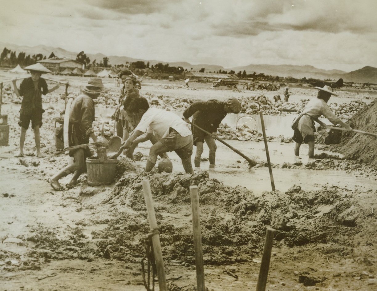 Building A Field For “Iron Birds”, 9/29/1943. Somewhere In China – Working with ancient tools and with the indomitable will and spirit that has gained the respect of the world for the people of China. These natives mix mud and water which will bind bricks together for an Air field “Somewhere in China.” 9/29/43 Credit Line (U.S. Army Air Forces Photo From ACME);