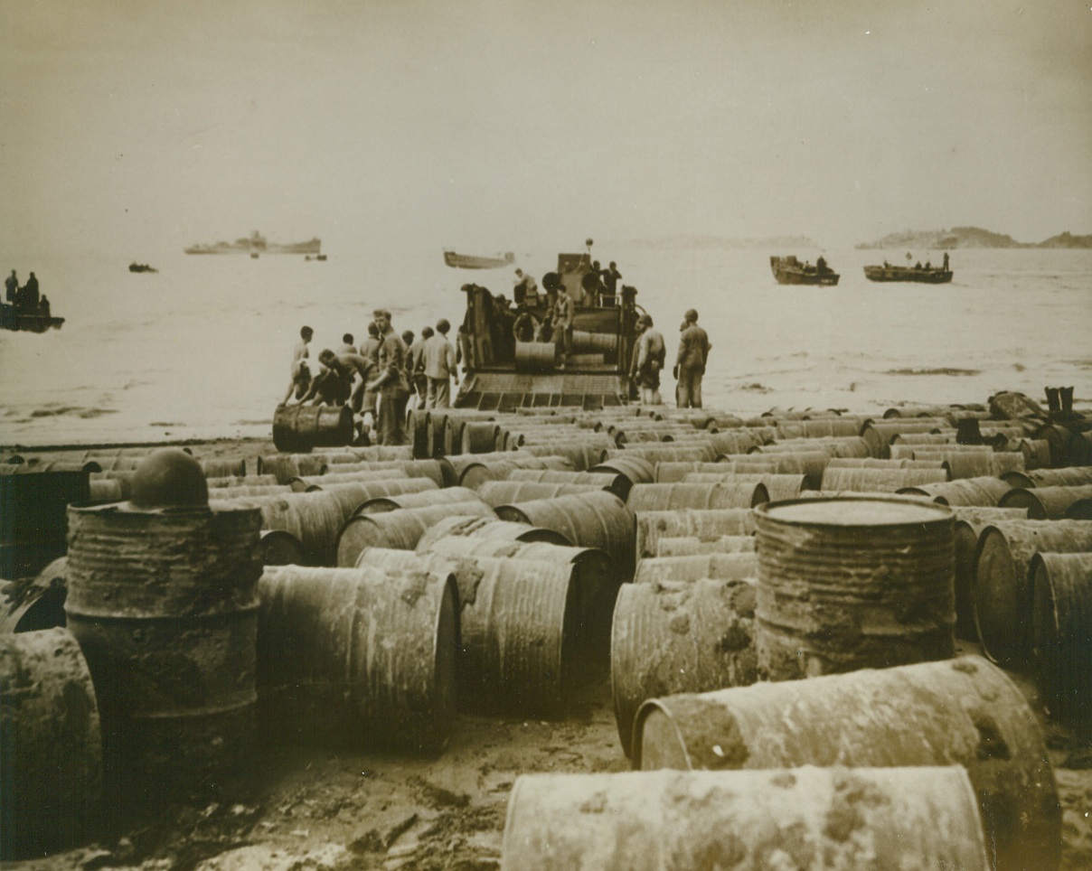 Fuel To Keep Leatherneck Tanks Rolling, 9/24/1943. Somewhere In The South Pacific – Hundreds of drums of oil, rolled from a landing lighter, crowd the beach of a South Pacific Island. Awaiting removal by work gangs of the U.S. Marines, the drums of oil will turn the wheels of tanks, boat engines, and jeeps that bring our Leathernecks nearer and nearer to Tokyo. 9/24/43 Credit Line (U.S. Marine Corps Photo From ACME);