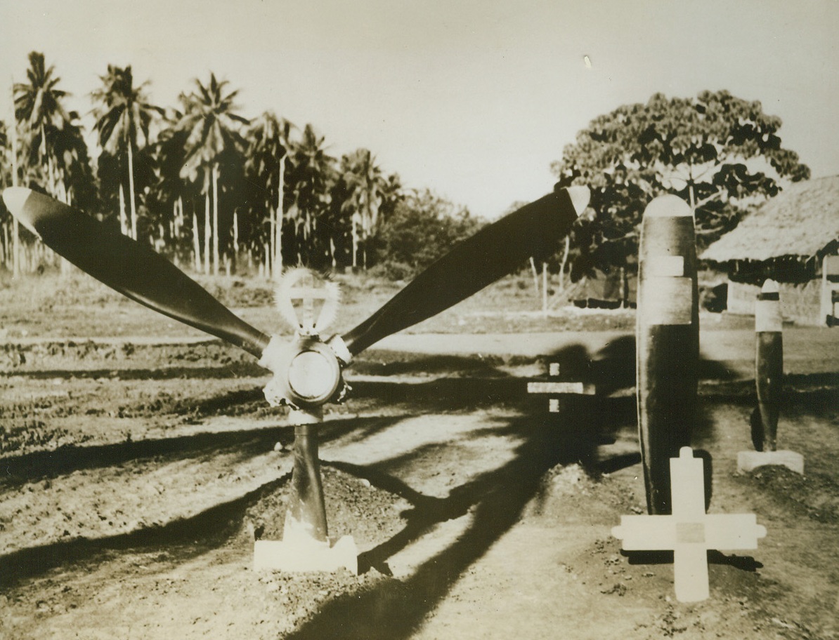 Graves Of Heroic U.S. Fliers, 9/29/1943. Solomon Islands – These propeller blades mark the last resting places of American aviators who died in defense of their country in fighting over Guadalcanal and the Solomon Islands. Today, in the southwest Pacific, their buddies are extracting a terrible toll in Jap planes and have captured virtual superiority in the air. 9/29/43 Credit Line (U.S. Navy Photo From ACME);