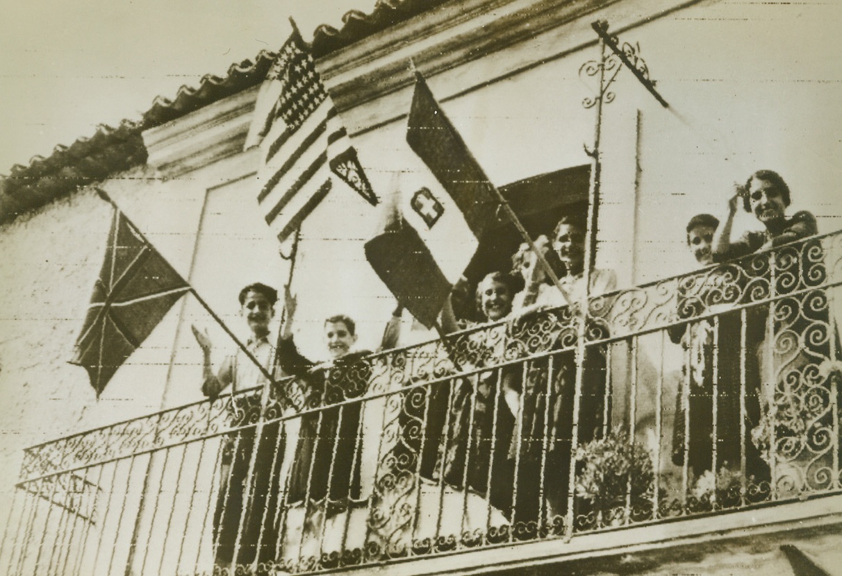 Flags out For The Allies, 9/16/1943. The Stars and stripes, a homemade Union Jack, and an Italian flag (hung upside down), are hung from this balcony in Staletti, Italy, in the Salerno area, as Canadian troops under Lt. Gen. Mark W. Clark enter the town. Today, Clark’s forces are advancing against stubborn German resistance, after eight days of the bloodiest fighting in the Mediterranean Campaign this photo by the Canadian Army, was flashed to New York by Radio today. 9/16/43 Credit Line (OWI Radiophoto ACME);
