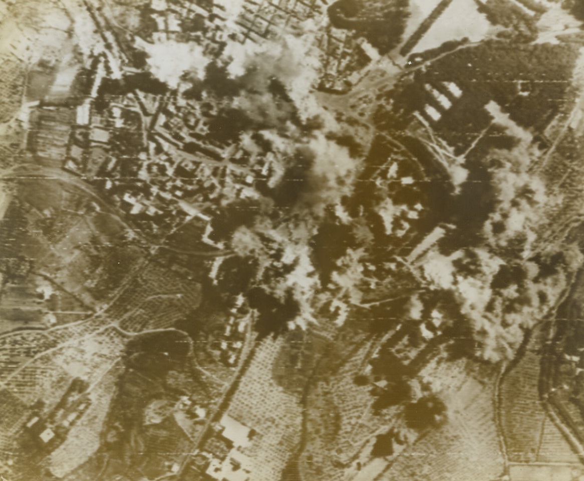 Smoking Out the Nazis, 9/12/1943. Italy – Bomb bursts blanket the town of Frascati, Italy, as Flying Fortresses of the Northwest African Air Forces destroy the German military headquarters located there. The furious September 8 raid followed the capitulation of Italy. Credit: AAF photo by Signal Corps Radiotelephoto from ACME;