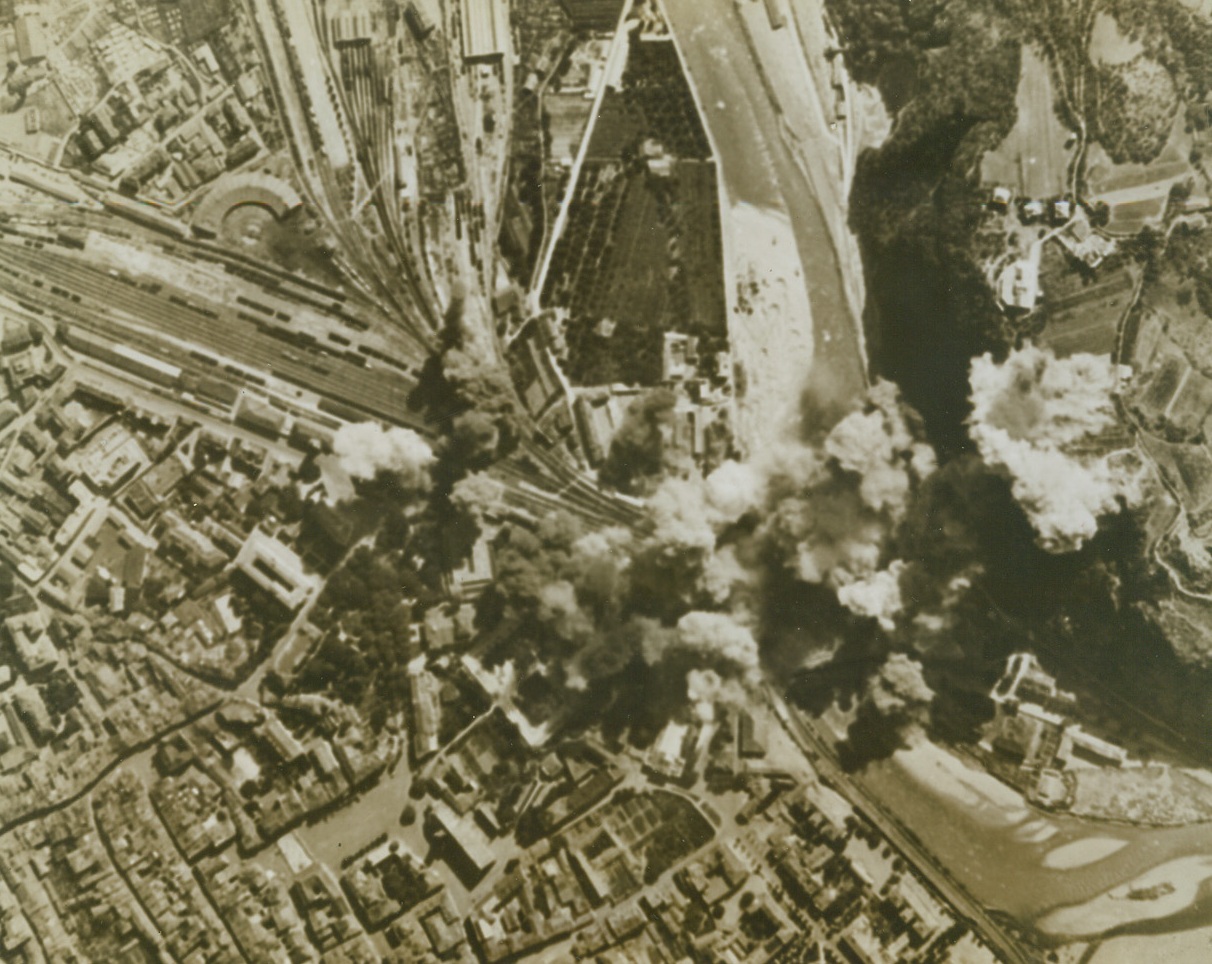 Two More Military Targets Picked Off, 9/12/1943. Italy – A double-track electrified railroad and the Piaggio Aircraft Factory in Pisa, Italy, get a load of bombs from U.S. Flying Fortresses. The River shown is the Arno, and the road and bridge at lower left of photo lead to the famous Leaning Tower of Pisa which was not disturbed. Credit: Army Air Forces photo from ACME;