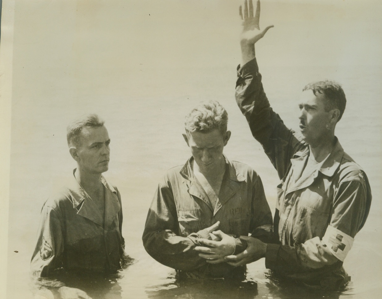 Americans Baptized in Mediterranean, 9/27/1943. SAN AGATA, SICILY — This photo, taken on the occasion of the first baptism in the Mediterranean Sea conducted by Chaplain Harvey Floyd Bell, (right), from Greshamville, Ga., was taken off the north shore of Sicily 15 miles east of San Agata. Chaplain Bell, who is attached to an American infantry unit and who is of the Baptist-South Church, is shown baptizing Pvt. John Davis, (center), of Harrisonburg, Va. Credit: (U.S. Signal Corps Photo from ACME);