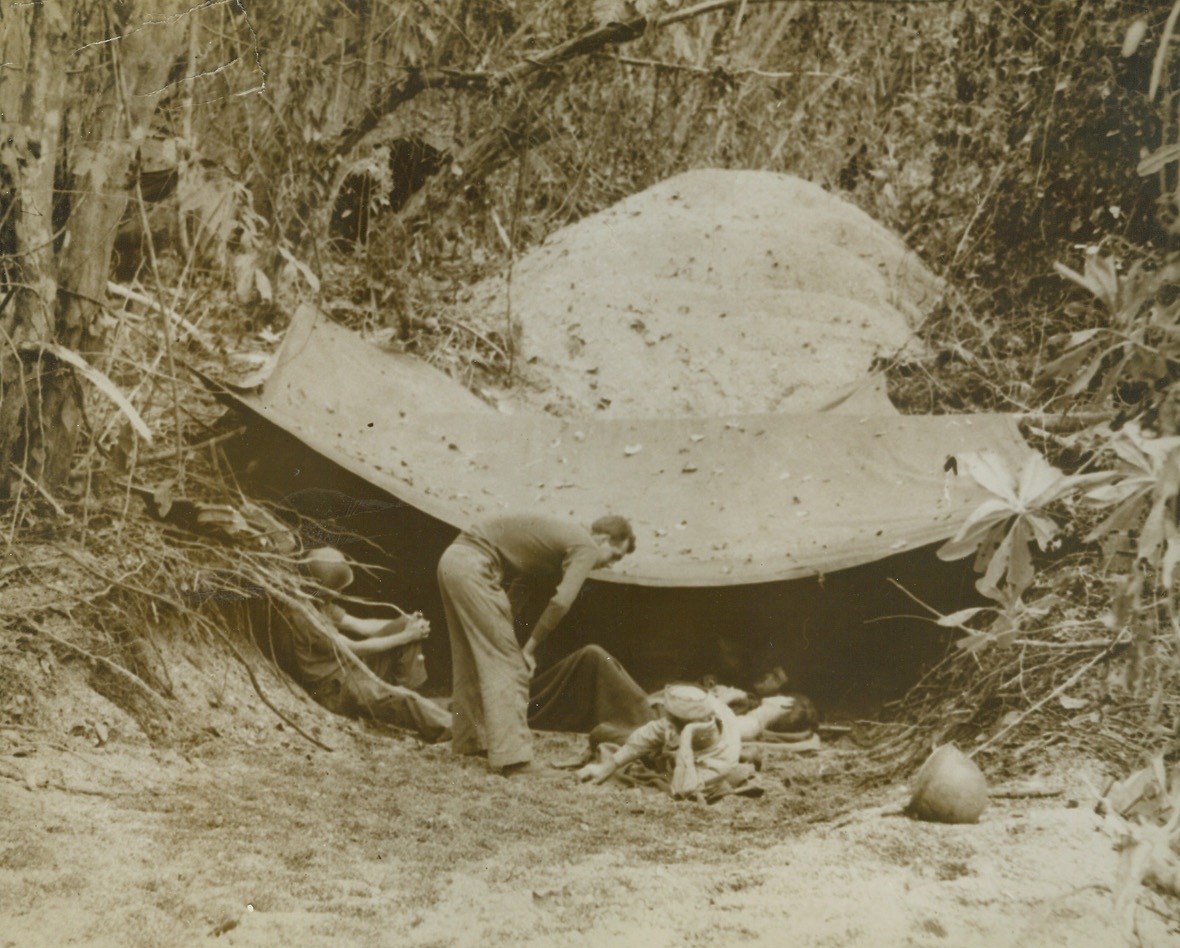 Protection From Further Wounds, 9/12/1943. New Guinea—While awaiting transportation to a hospital, American fighters wounded in the battle for Salamaua are placed in dugouts near the front. Corporal Paul Schofield, of New Bedford, Mass., bends over some of the victims who await the arrival of barges on a beach near the scene of fierce fighting.Credit Line (ACME);