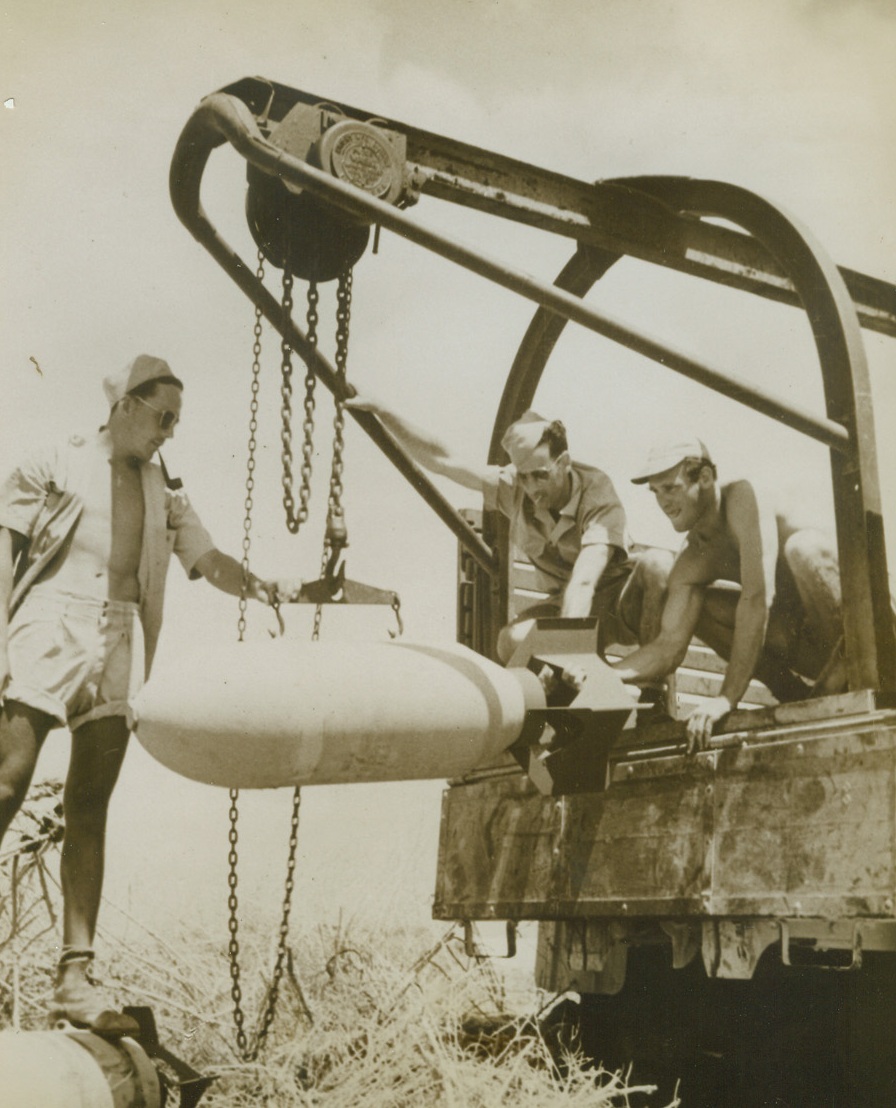 UP SHE GOES, 9/16/1943. IN THE CENTRAL PACIFIC—Three Air Force ordnance men load a 500-pound bomb into a truck at a Central Pacific base where personnel of the Seventh Army Air Foce are trained. Left to right: S/Sgt. Nicholas Karpinsky, Passaic, NJ; Pfc. Donald Arehart, Earlham, Ia.; and Sgt. Robert Cuinn, New York City. Credit: ACME.;