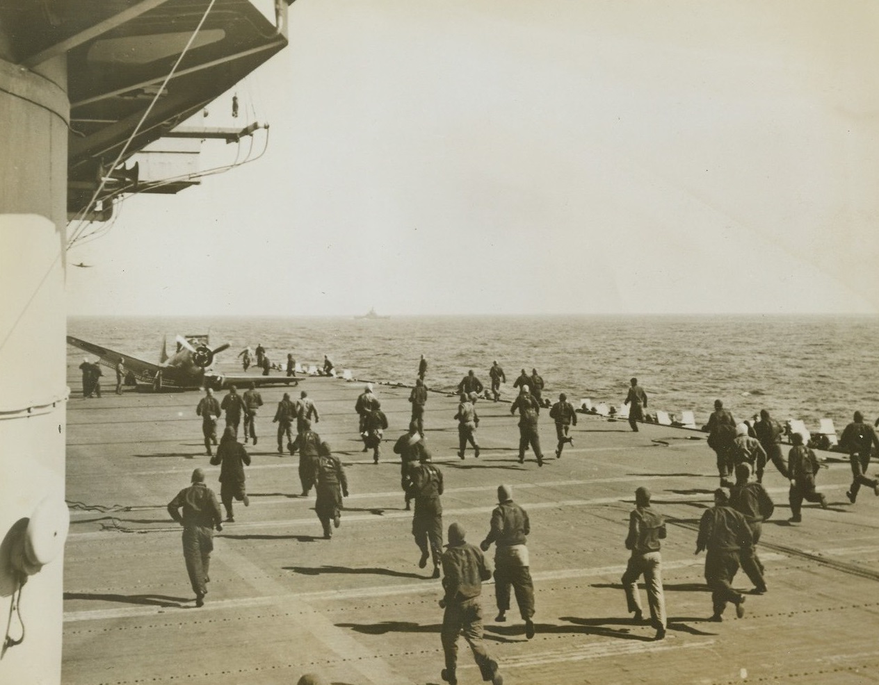 “Hot Squat”, 9/29/1943. Somewhere at sea – Crewmen of a U.S. Aircraft Carrier race to the assistance of the pilot of a Douglas Dauntless Dive Bomber which “pancaked” on the deck of the flattop. The pilot was not injured and the deck crew quickly ran the plane below, where it was repaired and put back into service. Credit: U.S. Navy photo from ACME;