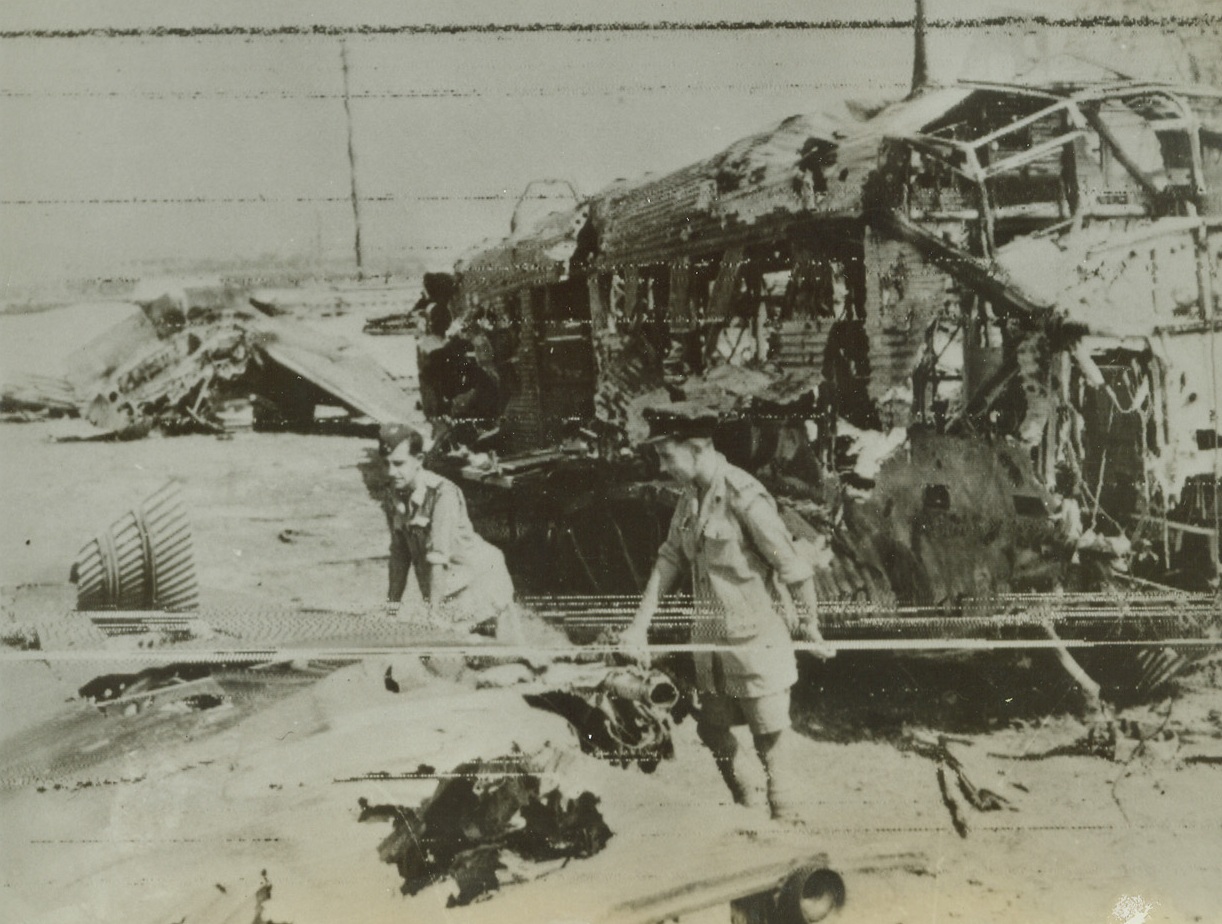 Littered Airfield, 9/30/1943. Lae, New Guinea – Wrecked Japanese Warbirds and debris from a bomb-ruined hangar litter the captured airfield at Lae. In the background, a half-sunk enemy ship tilts at an angle. Latest reports from New Guinea indicate that Australian forces have advanced deeper into Jap defenses around Finschhafen, while Allied fliers continue to pound the air base at Wewak 9/30/43 Credit Line (Photo By Frank Prist, Jr., ACME Photographer For War Pool);