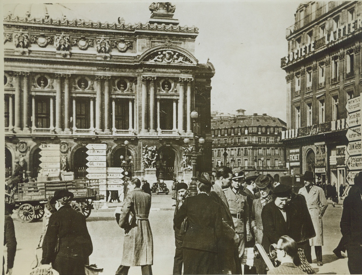 Paris Nowadays, 9/2/1943. Paris—This photo received through a neutral source shows the Place de L’Opera with the famed opera house in the background (left). Huge white sign have been placed around the square so that the “German guests” will be able to find their way around. Note Nazi officers in right foreground in midst of a group of Parisians who seem to turn away sullenly from his gaze. Credit: ACME;