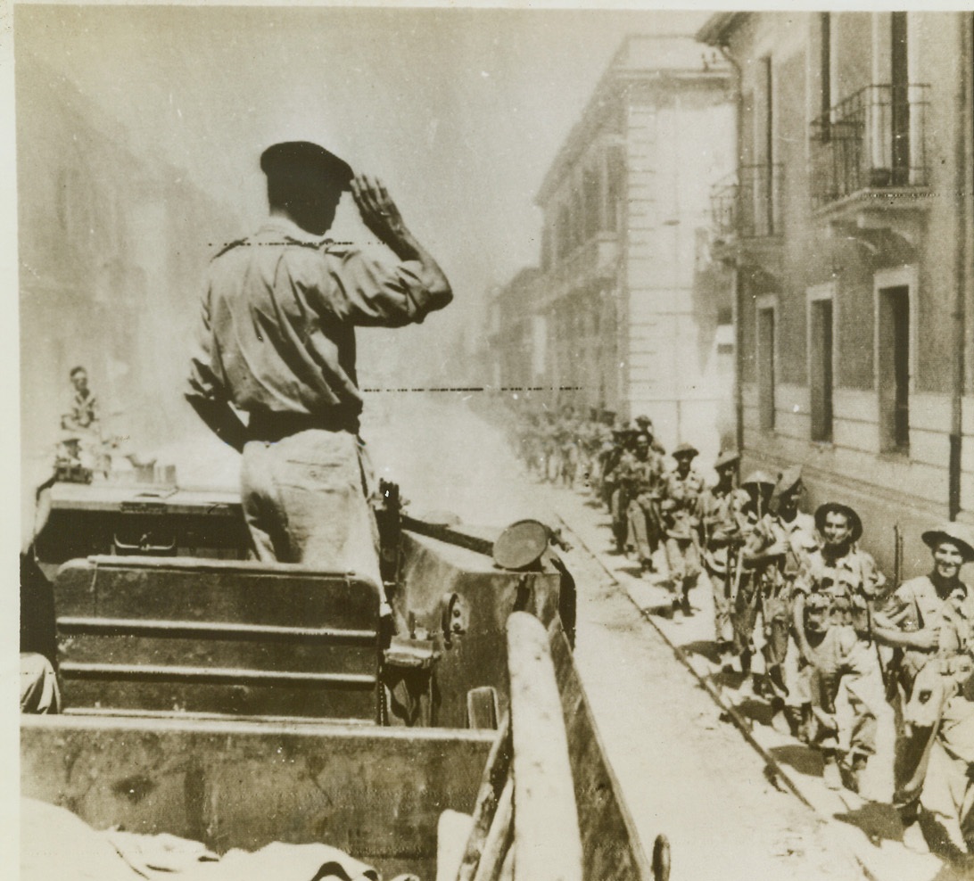 Victor’s Salute, 9/7/1943. Italy—General Bernard L. Montgomery, chief of the British 8th Army, salutes his fighting men as they pass through a street in Reggio Calabria. This is the first photo of the Allied foothold on the continent of Europe and since it was taken the 8th Army has driven steadily ahead on the Calabrian coastal road extending the invasion around Italy’s southernmost tip to about 60 miles. Credit: OWI Radiophoto from ACME.;