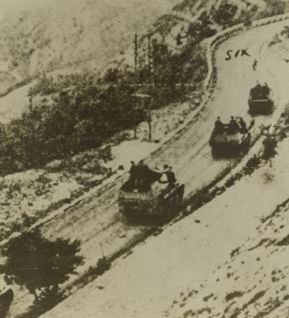 Nazi Reinforcements in Italy, 9/19/1943. ITALY—Led by a motorcycle, German motorized units roll southward over a curving north Italian mountain road, according to the German caption of this photo appearing in a Berlin newspaper. These four tanks may be on their way to reinforce northern garrisons taxed with quelling Italian resistance. Credit: ACME RADIOPHOTO.;