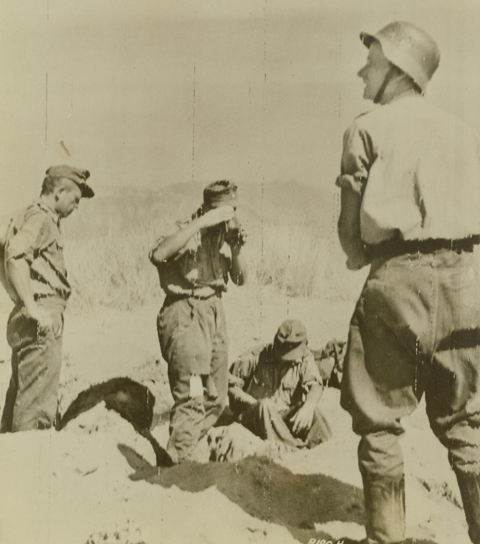 Defense Against their Own Planes, 9/17/1943. ITALY—After losing their first encounter with American troops on Allied soil and being taken prisoner; these crestfallen Nazi soldiers dig foxholes to protect themselves from bombing and strafing by their own planes. One Nazi takes a drink from his canteen before digging in. Credit: SIGNAL CORPS RADIOTELEPHOTO FROM ACME.;