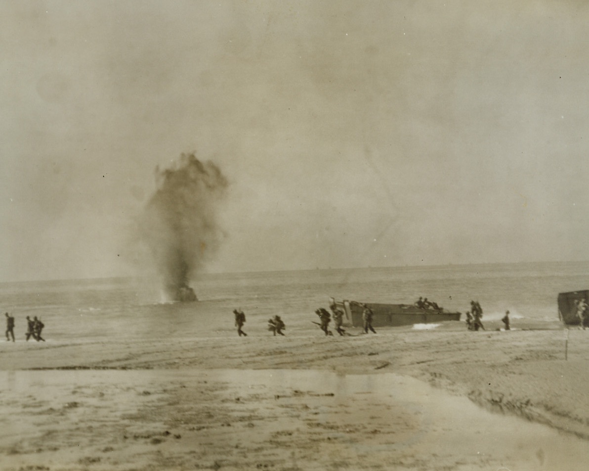 Shelling Our Boys on the Beach, 9/24/1943. IN THE NAPLES AREA – An enemy shell sends a geyser of water shooting up in the background as Allied soldiers land in the Naples area. As the shells fly thick and fast, the boys scamper up the beaches, from landing craft. Credit Line (Photo by Charles Corte, ACME Photographer for War Pool);