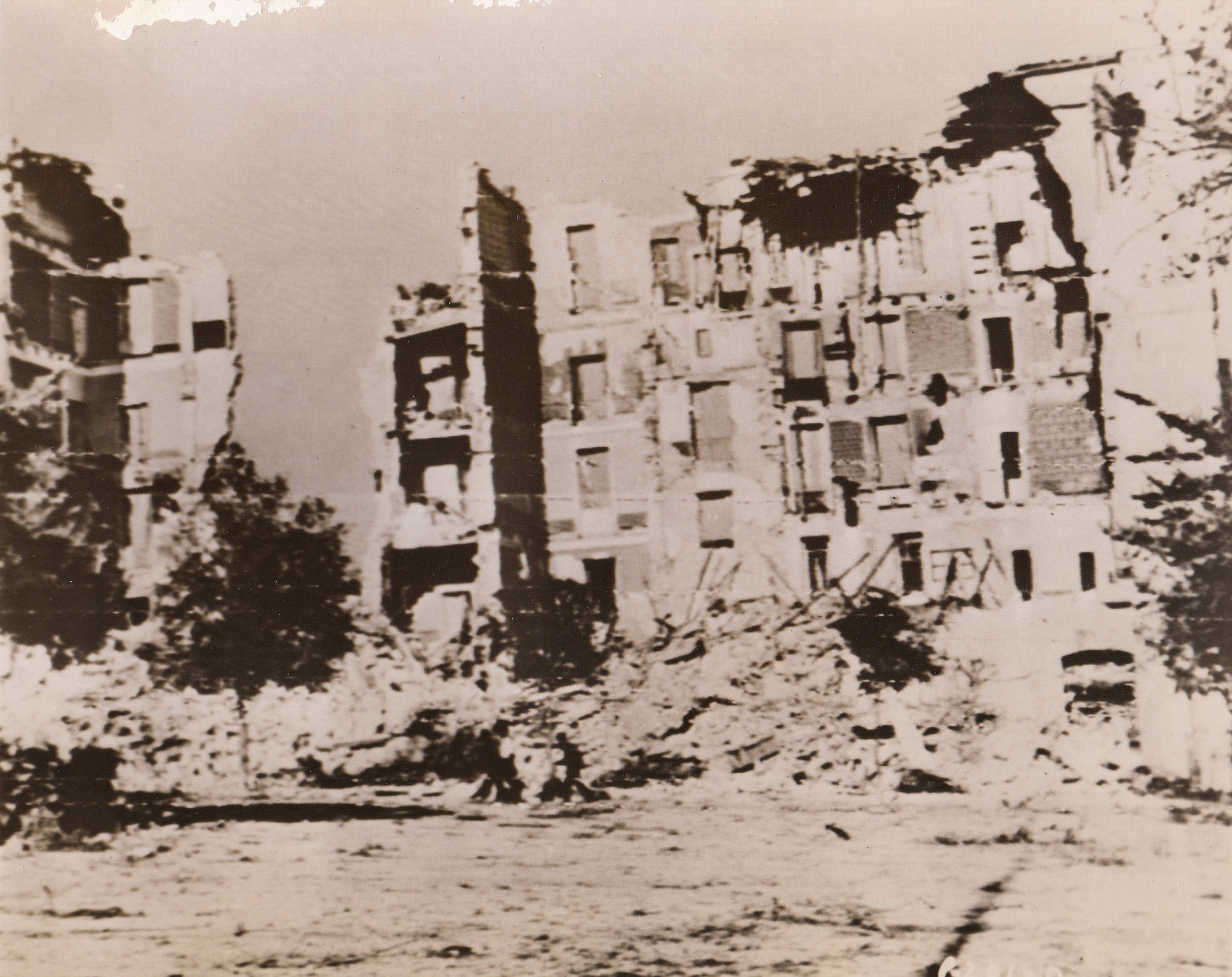 Direct Hit, 9/18/1943. ITALY – As the shell casing flies into the air, the crew of howitzer mounted on a half-track watched the shell they’ve just fired score a direct hit on an Italian tobacco factory, being used by the Germans as an artillery observation post. The crew, operating in the battle for the Italian mainland, is commanded by Sgt. Eugene Frey of Denver, Colo. CREDIT (U.S. Signal Corps Radiotelephoto from ACME) 9/18/43;