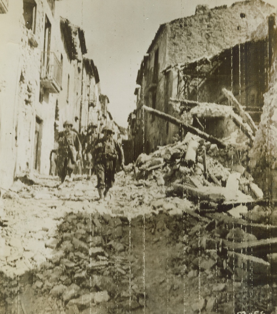 Yanks Take Altavilla, 9/26/1943. ALTAVILLA, ITALY – Members of an engineer combat team patrol the streets of Altavilla soon after the Italian town was captured by American troops. Credit (Signal Corps Radiotelephoto from Acme);