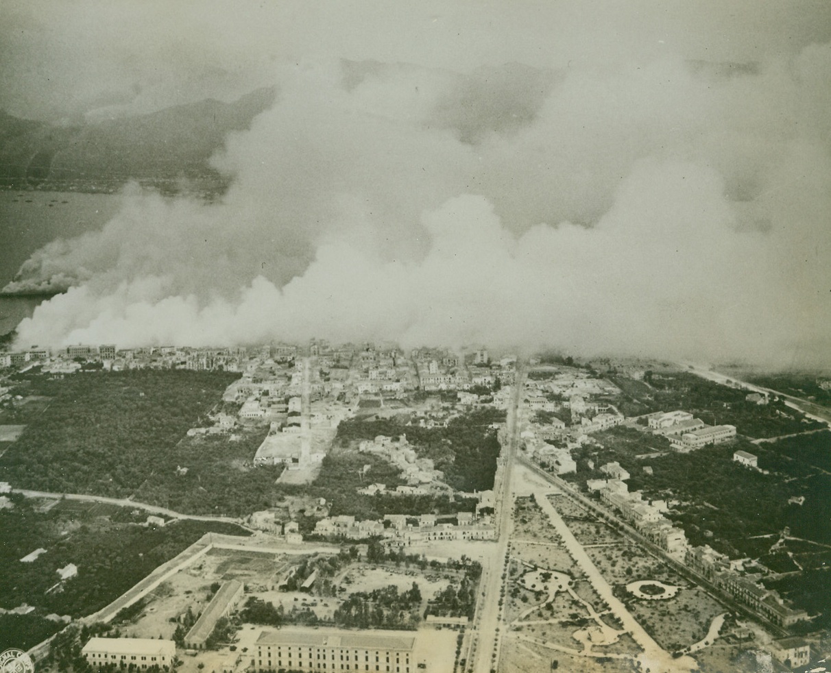 Protective Smokescreen Over Palermo (#1), 9/27/1943. PALERMO, SICILY – During a recent demonstration, the Chemical Warfare Branch of the U.S. Army Service Forces covered Palermo with a protective smokescreen. Here, clouds of smoke start streaming over the city from many points. Credit Line (U.S. Signal Corps Photo from Acme);