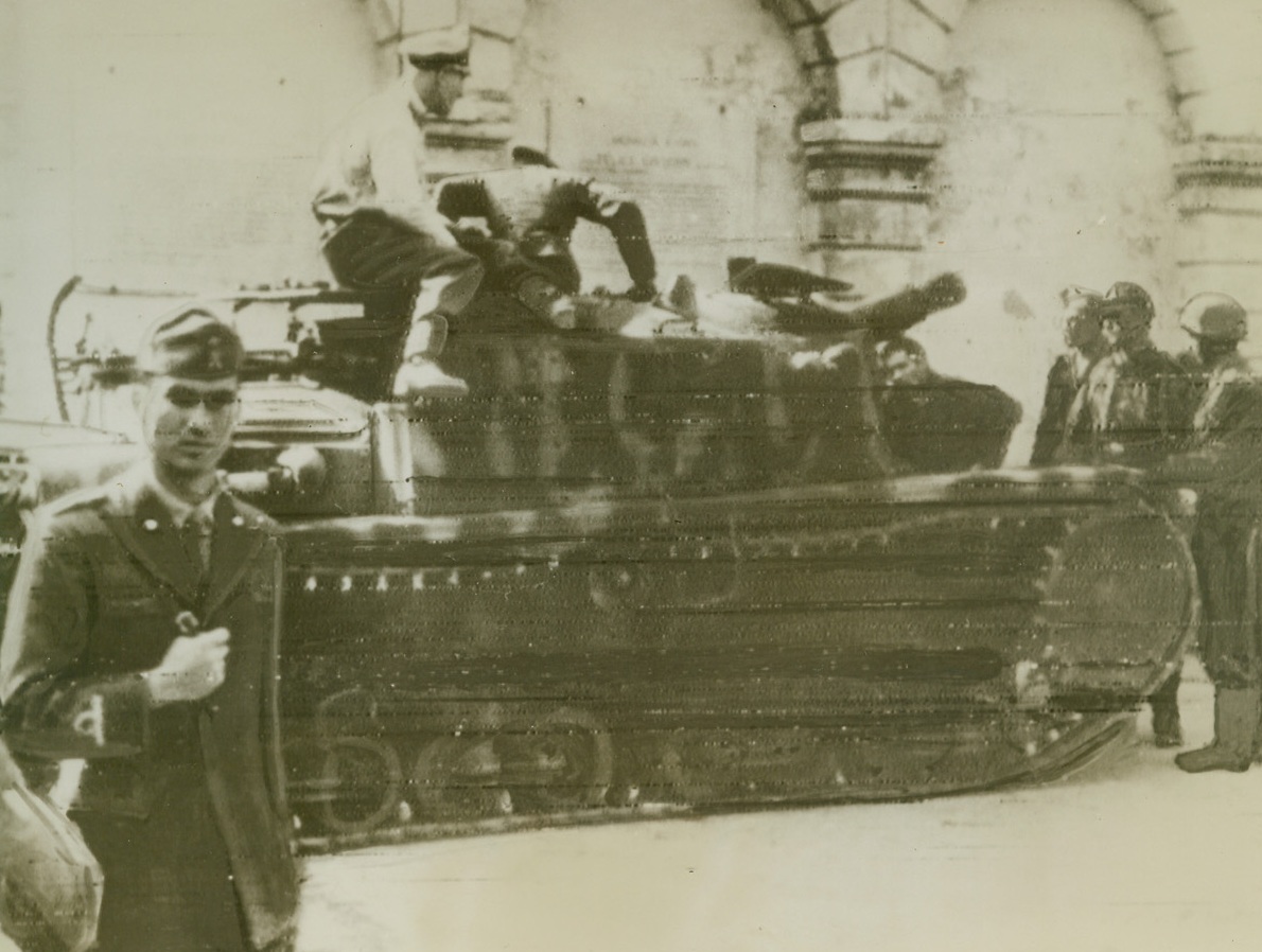 NAZIS GRAB ITALIAN TANK, 9/16/1943. NORTHERN ITALY—German soldiers take over an Italian tank in northern Italy, where the “supermen” are battling their former allies. Nazis are using much “commandeered” equipment in the fight for Salerno, where Americans and British are clinging tenaciously to their beachhead, in spite of savage German assaults. Photo radioed from Stockholm to New York today (Sept. 16th). Credit: Acme radiophoto;