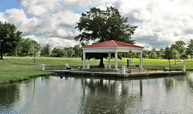 MacArthur Park features ample green space with historic signs and markers, dog parks, handicap-accessible playground equipment, and a fishing pond.