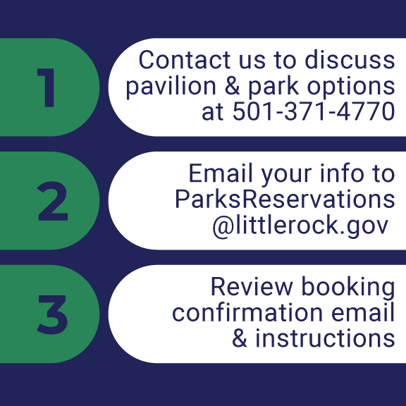 Email your information to ParksReservations@littlerock.gov to start the reservation process. You’ll need to provide the following information:
