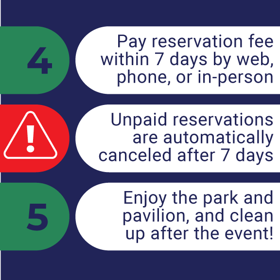 Once you have verified the reservation, you will need to pay within 7 days of booking. Any reservation that has not been paid in full within 7 days is automatically canceled. This policy exists because of the staff time required to offer the opening, closing, and cleaning of these facilities.