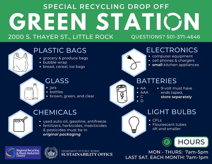 When in doubt, find out! If your item is not accepted at the Green Station, and it's not listed on the Special Items page, please contact us at recycle@littlerock.gov or at 501-371-4646.