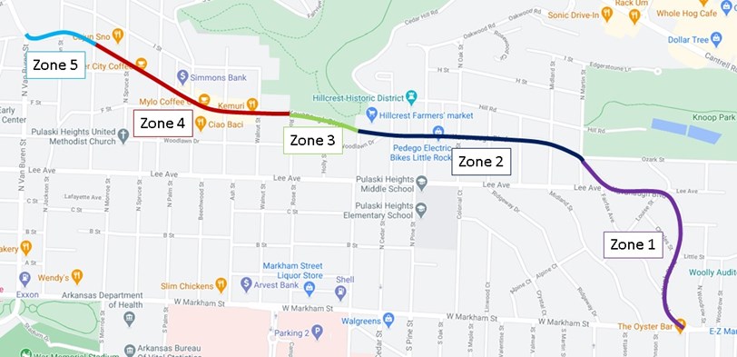 Kavanaugh Boulevard between Markham and Van Buren is typically a 40-42 ft. wide street with two lanes. It has a speed limit of 30 mph, but wide lanes (20-21 ft. wide west of Martin if no parked cars) encourage higher vehicular speeds traffic and are less safe for people driving, biking, or walking. Kavanaugh has 7.9K vehicles per day just south of Cantrell (outside the resurfacing zone, but the closest ArDOT estimate). Sidewalks are present throughout, but vary in width and condition. Separating Kavanaugh into five zones (Fig. 1), Zone 1 is a long hill and has fog lanes demarcating parking, Zone 2 is also a long hill east of Oak St. but does not have fog/parking lanes, Zone 3 has the Allsopp Park promenade curb extensions, narrowing Kavanaugh to 35 ft. in places, Zone 4 is the business district, and Zone 5 is designed much like Zone 2.