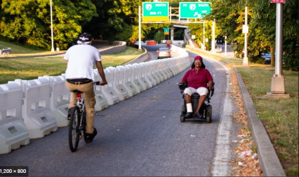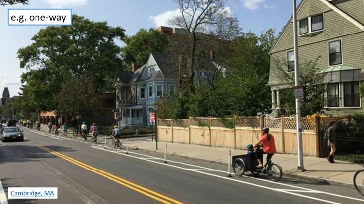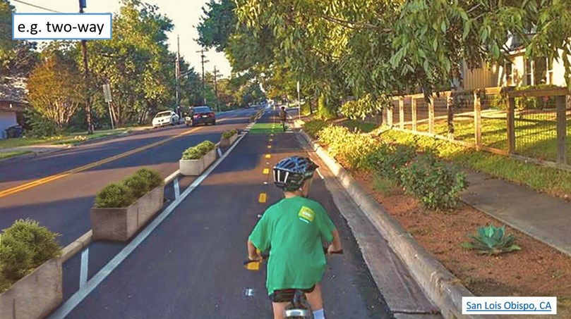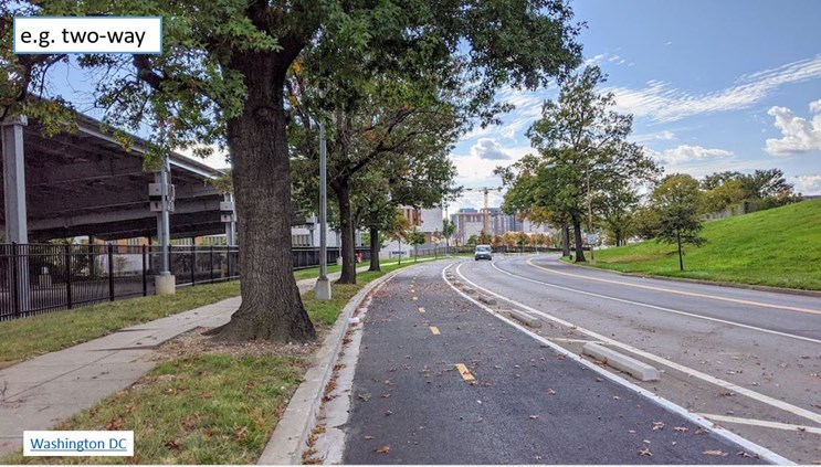 Figure 23. A suitably protected two-way cycle track (or sidepath) can be an alternative route for someone jogging or on a mobility device (especially important when the sidewalk is in disrepair) in a way that a one-way bike lane cannot (insufficient room to pass).