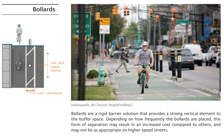 Figure 25. FHWA’s description of bollards as a physical protection for a bicycle facility.